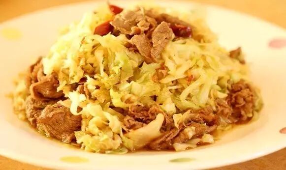 原料:圆白菜、瘦肉、大蒜、花生油、水淀粉。