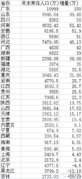 第一经济大省广东增量最大。,2016年末,广东常住为10999万人,总量比上年净增150万人,增长1.38%,增幅比上年提高0.21个百分点,是全国唯一一个增量突破百万大关的省份,遥遥领先其他省份,广东增量占全国增量的18.5%。