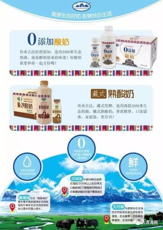 青海雪峰乳业生产制作的青海湖酸奶,采集青海湖畔饮雪山融泉、吃高原青草、在纯天然无污染的高原牧场自由生活的乳牛牛奶,然后采用传统藏式古法原理,利用现代先进的生产灌装设备,得以大规模生产高品质酸奶。同时不添加任何香精和防腐剂,将天然健康的理念贯彻到底。只需轻轻吸一小口,闭上眼睛,雪峰、草原、牛羊和清凉的湖泊仿佛就在眼前。青海雪峰乳业在传承并遵循传统酸奶制作工艺的基础上,还不断地在酸奶的包装形式上进行变革创新,以更方便大众消费者携带食用,更环保也更方便运输。