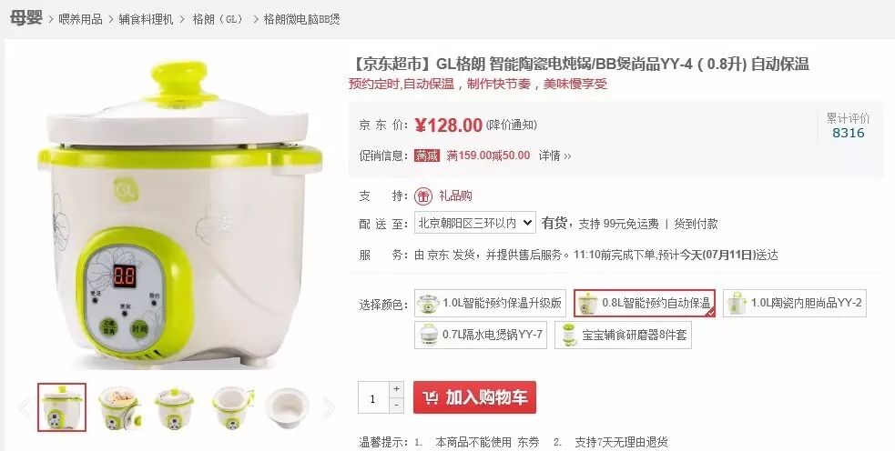 1、0.8升的容量。宝宝吃得少,这个容量刚好够宝宝吃一餐,家里煮粥的锅具一般都没有这么小,免去用一个大锅煮一小碗粥的尴尬。另外,家里的锅具经常用来煮其它东西,虽然有洗干净,但总有一些残留的东西在里面,一岁以内的宝宝盐和糖都不能放,更别说不小心吃到其它东西了。