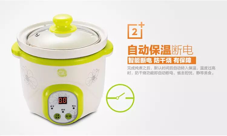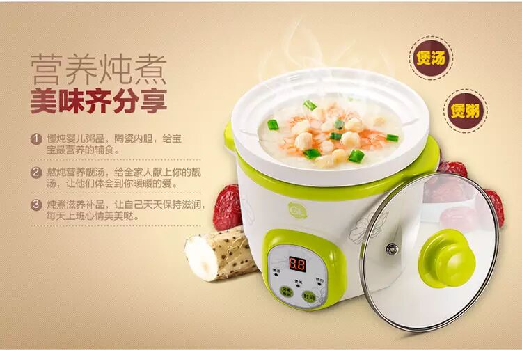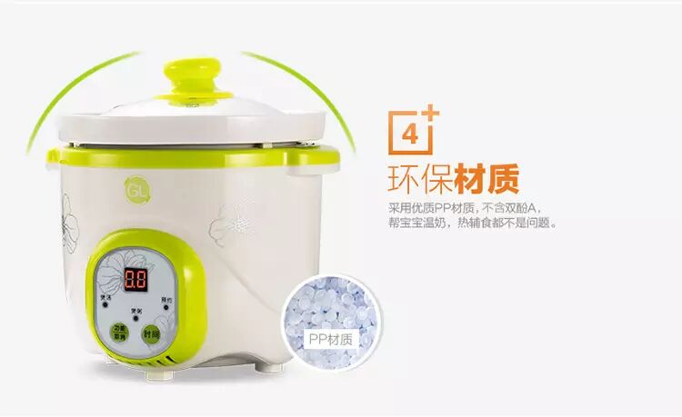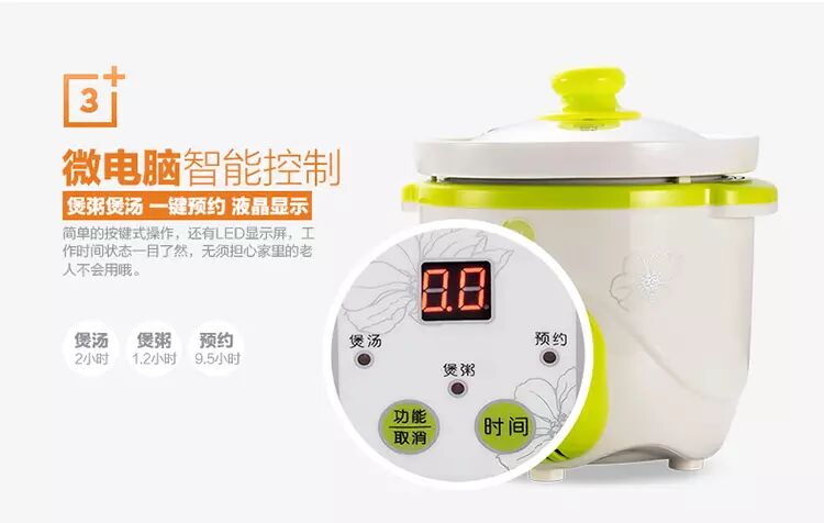 3、微电脑智能控制。宝宝的粥需要细火慢炖才能煮出适合宝宝吃的软绵口感,这款BB煲煮粥一般需要1小时20分钟,时间虽然长,但是有9.5小时超长预约功能,并能自动保温。只需要把原料和水提前准备好,就能轻松解放妈妈的双手,不用看火,可以放心陪宝宝玩了。