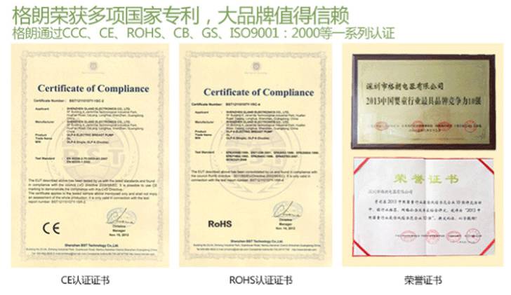 格朗产品不仅取得了国内多项安全认证,还有欧盟、德国的安全认证,可放心使用。