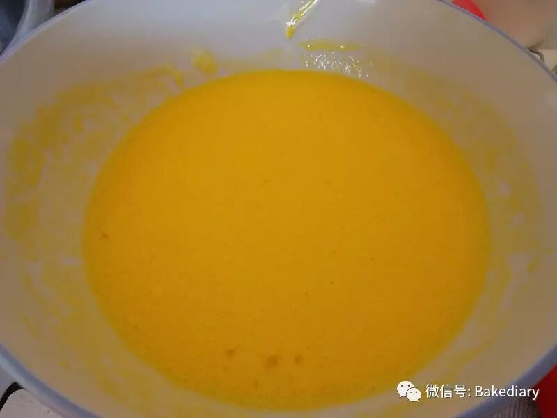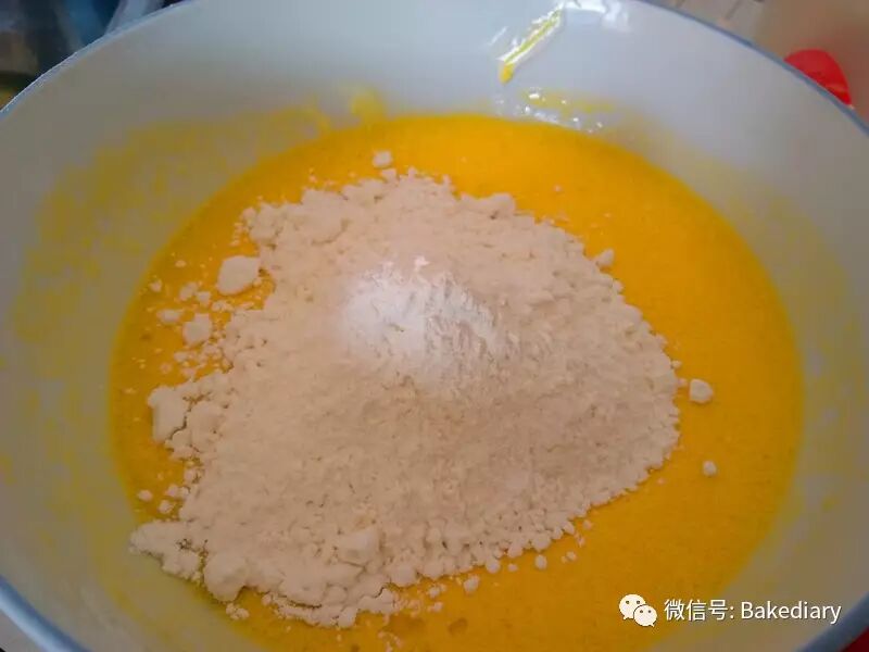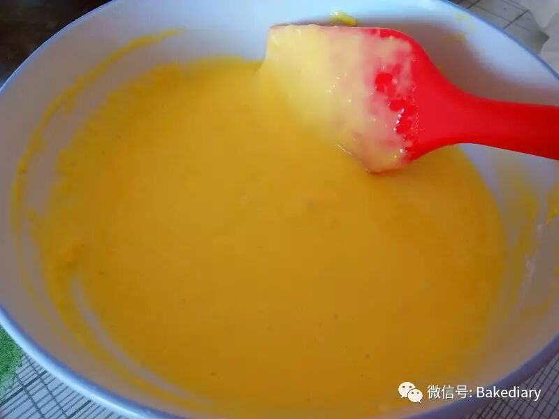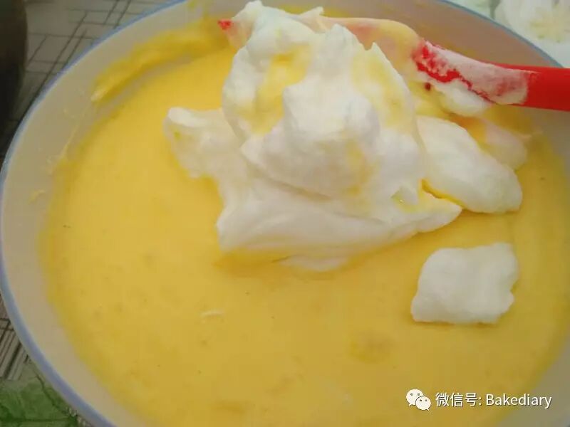 5. 取1/3打发好的蛋白放入蛋黄糊,搅拌均匀;