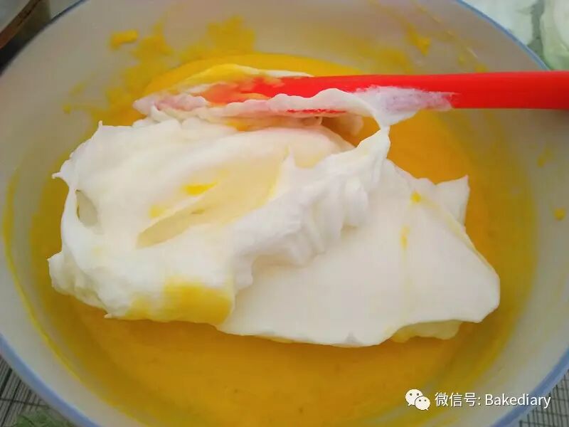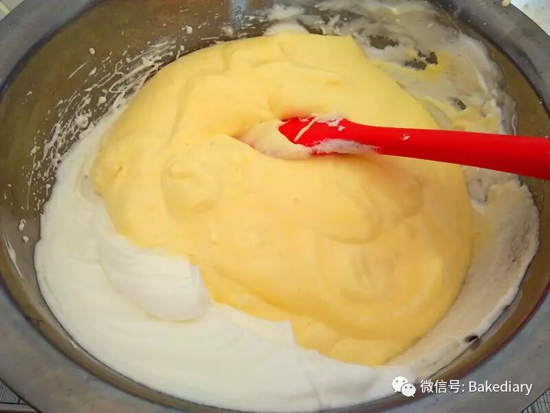 7. 把搅拌好的蛋黄糊倒回蛋白中,搅拌均匀;