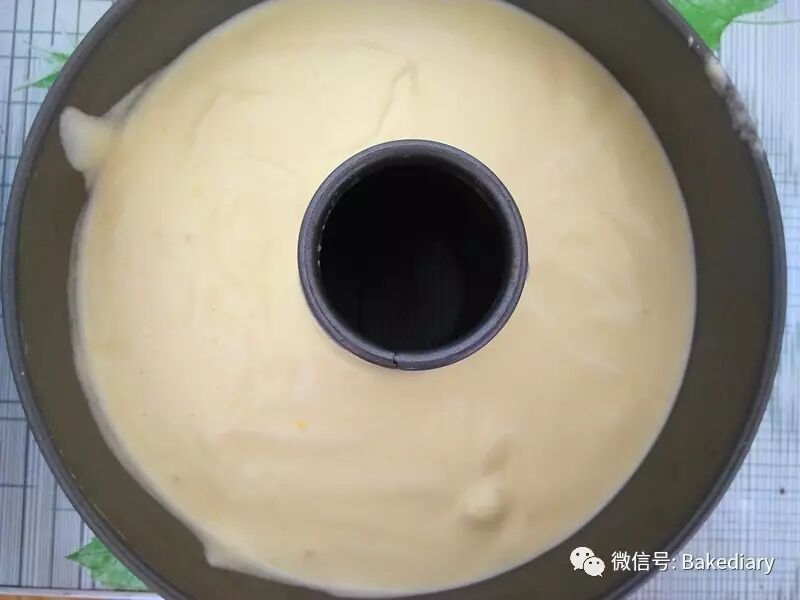 8. 搅拌好的蛋糕糊倒入中空模,轻震几下,震出气泡;