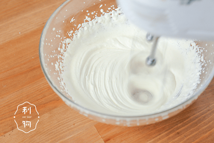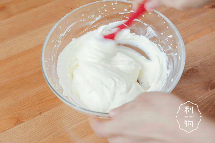 ▼ 1. 酸奶慕斯 淡奶油加砂糖打至8分发,混合加入酸奶,搅拌均匀。