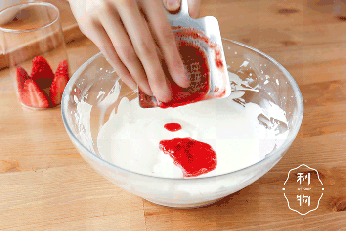 食谱中做的是分层慕斯,分两次冷藏,底部为酸奶慕斯,上层为草莓慕斯。实际操作中也可以直接将这两者混合,制作成草莓酸奶慕斯,味道也很不错。