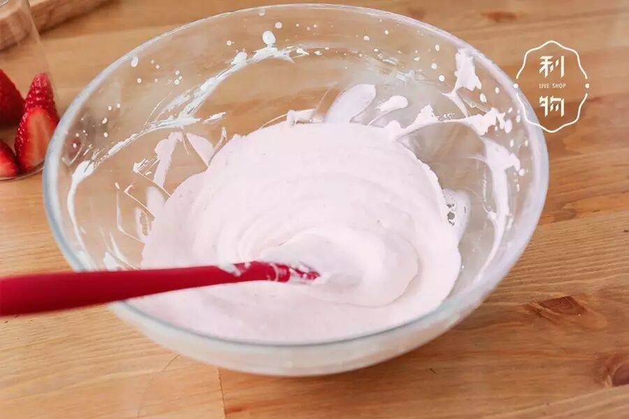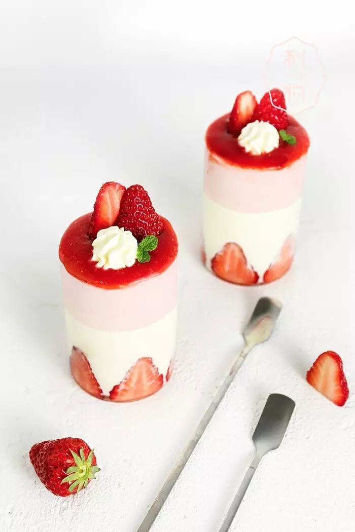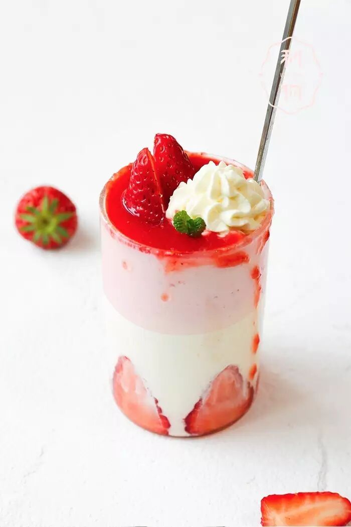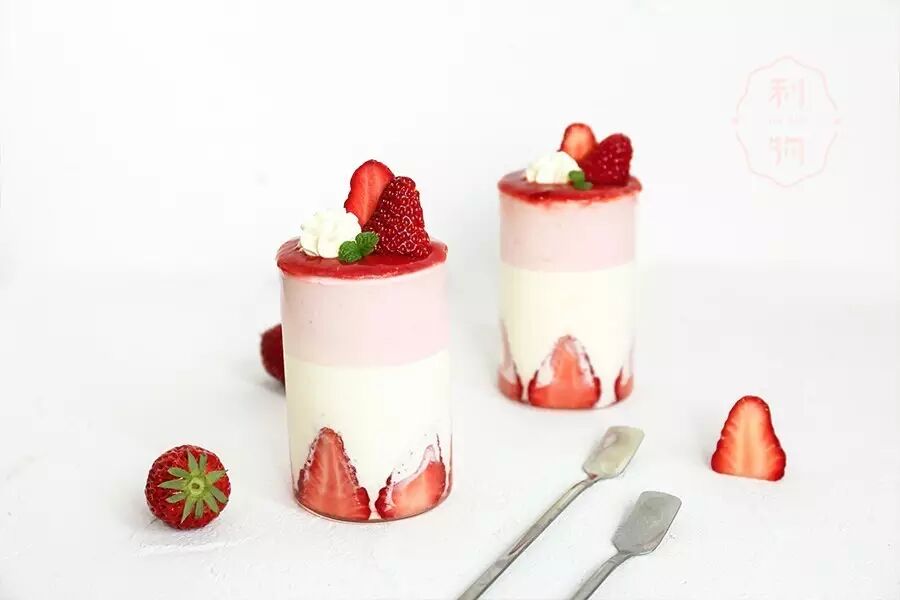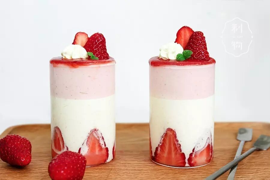 ▼ 4. 草莓慕斯 打发淡奶油,磨入草莓泥,加入吉利丁溶液,搅拌均匀,装入杯中,冰箱冷藏1小时。