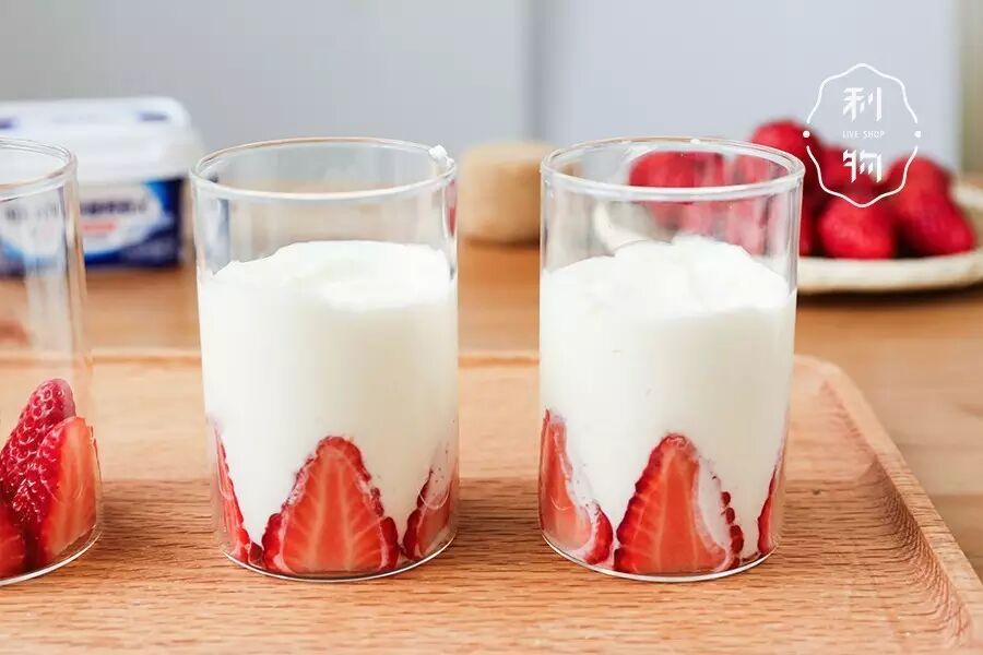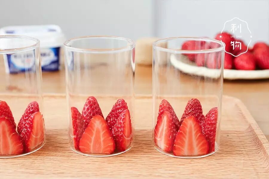 ▼ 3. 第一次装杯 草莓去蒂对切,竖直摆到杯中,将酸奶慕斯倒入杯中,震平,冰箱冷藏1小时。