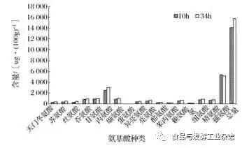 酸乳中含有的微生物具有蛋白分解活性,在酸乳发酵的过程中,酸乳中的蛋白质被乳酸菌产生的蛋白酶分解成多肽,多数进一步被微生物酶分解成氨基酸[23],因此传统发酵牦牛酸乳中含有多种类的游离氨基酸。由图5可以看出,在传统发酵牦牛酸乳发酵过程中,85%的游离氨基酸是在前10 h的发酵过程中形成的,在10 h到34 h的发酵过程中,游离氨基酸含量由10 h的14 070.80 μg/100 g上升至34 h的15 731.07 μg/100 g。这是由于微生物在前10 h比较活跃,产生蛋白酶分解大量蛋白质,而发酵后期微生物活动减弱,加之酸度高使得蛋白酶活性减弱,蛋白质不能被继续分解,因此在发酵后期的24 h里,游离氨基酸含量并没有明显的上升。2种样品中的游离氨基酸仅有脯氨酸有下降趋势,由原来的5 328.53 μg/100 g下降至5 163.40 μg/100 g。这是由于脯氨酸是一种风味剂,可生成香味物质,我国GB2760—86规定脯氨酸可用作香料[23]。传统发酵牦牛酸乳后熟的24 h是酸乳风味形成的关键时期,脯氨酸作为风味剂参与酸乳风味的形成,因此会有部分减少。