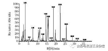 由图8可以发现,传统发酵牦牛酸乳通过气质联用仪总离子流图给出20余个峰,经谱库检索、质谱分析并与标准谱图对照,选则其中14种具有代表性的风味物质,如表2所示。用校正面积归一法得出各成分的峰面积。