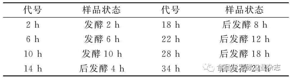在牦牛酸乳发酵过程中,分别按下面时间点取样进行各指标的测定。实验样品编号见表1。