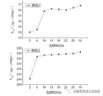 VB1、VB2具有水溶性,见光易分解,所以在发酵过程中测定B族维生素含量时会有所损失,它不能在体内存贮,是人体必须摄取的营养元素。传统发酵牦牛酸乳是采用的发酵原料,即牦牛乳本身就具有一定的B族维生素。由图7可知,在发酵过程中B1、B2的含量都有所上升,酸奶2在2 h时VB1的含量为31.73 μg/100 g,VB2的含量为210.07 μg/100 g,发酵至34 h时VB1的含量上升为36.58 μg/100 g,VB2的含量上升为218.04 μg/100 g。常海军[25-26]等测定牦牛乳中VB1、VB2的含量分别为30 μg/100 mL,170 μg/100 mL。艾日登才次克[27]测定的西藏部分地区传统发酵乳中VB1、VB2的含量19.60 μg/100 g、154.60 μg/100 g。和样品2中B族维生素相差不大,与之前研究结果一致。即B族维生素含量可以作为牦牛酸乳的特征理化指标之一。