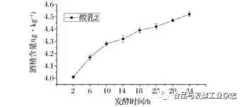酒精是酵母菌无氧呼吸的产物。传统发酵牦牛酸乳在发酵过程中有酵母菌的参与,属于典型的Ⅳ型发酵乳。酵母菌的存在不仅可以为酸乳提供一定的营养价值还能产生特殊的风味,是传统发酵牦牛酸乳特有的品质特征。由图2可知,传统发酵牦牛酸乳在发酵前期处于升高状态,由2 h的4.02 g/kg增加到10 h的4.26 g/kg。在后发酵时期酒精含量也有所上升,但相比于发酵前期,含量上升较小,仅上升了0.17 g/kg。酵母菌的最适生长pH在4.5~5.0,最适生长温度为30 ℃左右,传统发酵牦牛酸乳前发酵时期的发酵条件适于酵母菌的生长繁殖,酵母菌活性较高,产生酒精的速率大,而在后发酵的24 h,酸乳pH降低及4℃的低温使得酵母菌的活性较低,产生的酒精量较少。