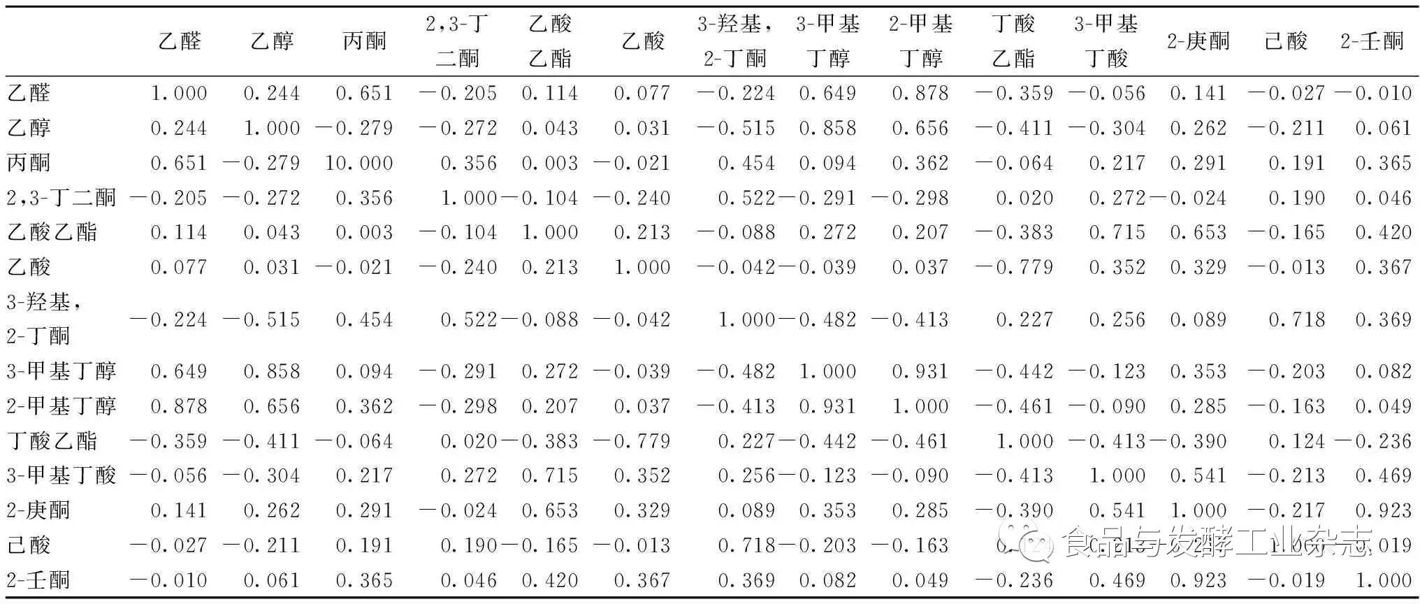 由表3可以看出,除第一行的2,3-丁二酮、乙酸乙酯以外,主成分几乎包括了原始变量80%的信息。乙醛与2-甲基丁醇,乙醇与3-甲基丁醇,3-甲基丁醇与2-甲基丁醇,2-庚酮与2-壬酮存在着极其显著的关系,乙醛与丙酮和3-甲基丁醇,乙醇与2-甲基丁醇,乙酸乙酯与3-甲基丁酸和2-庚酮,乙酸与丁酸乙酯,3-羟基,2-丁酮与己酸存在着显著关系。