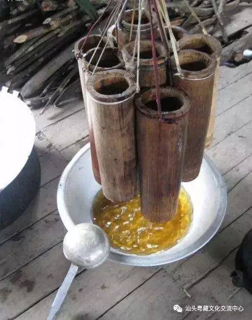 墨脱的黄酒是用当地特有的鸡爪谷和玉米酿成的,据当地人介绍,玉米脱粒晒干后,将玉米粒炒熟放凉;再将玉米粒、鸡爪谷蒸熟,晾凉,然后放在一个竹盘里,放上酒曲搅拌,最后再放入密封的罐子里,大约3--4天就差不多了。饮用时将发酵好的醪糟放入巴东里(一个圆柱状的竹筒,底部有孔),加入温开水,橙黄的酒水就从巴东的底部流了出来。盛情的主人会拿起一个瓢,“进门三瓢酒”是当地的传统。黄酒含在口里,有点酸、微甜,后劲很足。