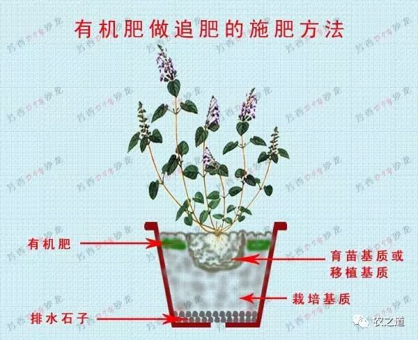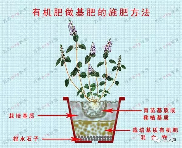 栽培植物时,预先拌入土中的叫“基肥”;上盆以后定时施用的叫“追肥”。