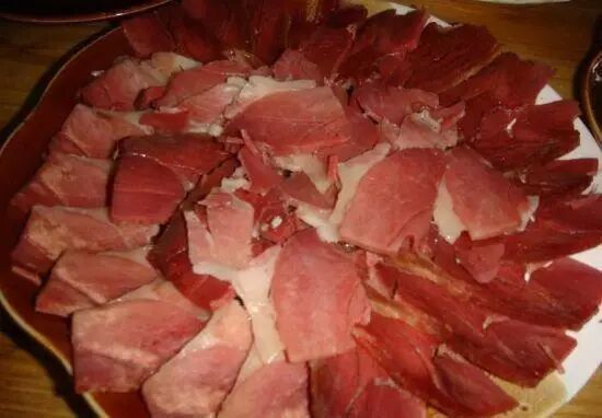 【吹猪肝】:纳西族请客时必备的一道传统名菜。它制法特殊,色美爽口。主料猪肝配以芫荽、炒花生米、盐、醋、油辣子、芝麻等拌在一起。吹猪肝是要在农历冬腊月,将鲜猪肝吹膨胀后晒干。制作时将猪肝煮熟,冷却后切成薄片拌上上述配料、佐料,拌匀就可作盘菜食用了。