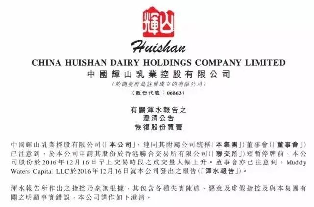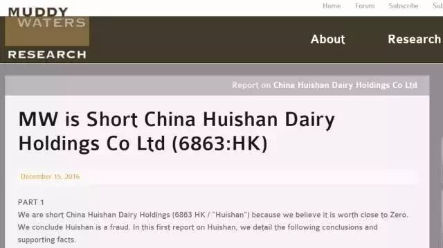 2016年的12月16日和19日,著名的做空机构浑水(Muddy Waters Research)接连发布了两篇做空辉山乳业(6863.HK)的报告,导致后者一度在16日上午紧急停牌,当日股价下跌2%至2.75元。