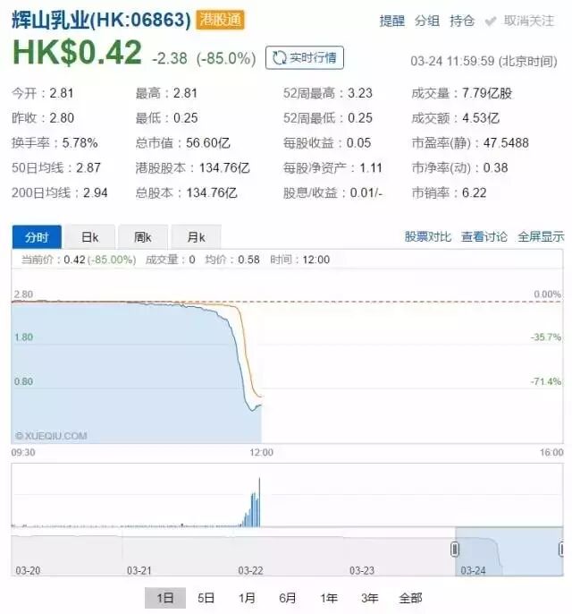 2017年3月24日上午,在香港上市的辉山乳业(6863.HK)短短半小时内突然暴跌85%,创下港交所最大跌幅。