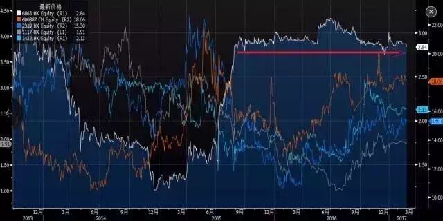 实际上,如果我们比较伊利股份、蒙牛乳业、现代牧业和中国圣牧的股价,辉山乳业(下图白线)简直稳过头了……