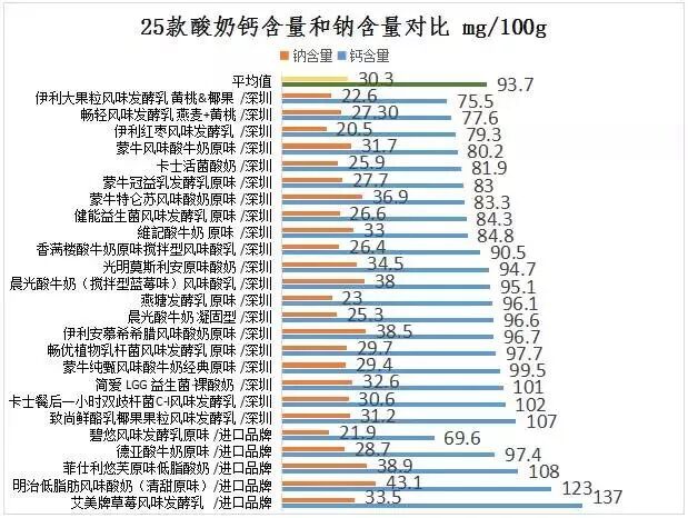 本次25款酸奶中,钙的平均值为93.7 mg/100g,钠的平均值为30.3 mg/100g。其中钙含量最高的为137 mg/100g;钠含量最低的为20.5 mg/100g。