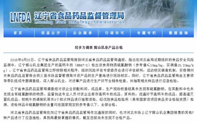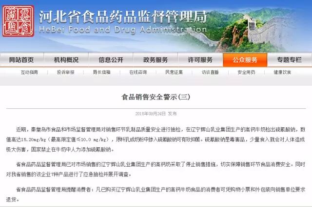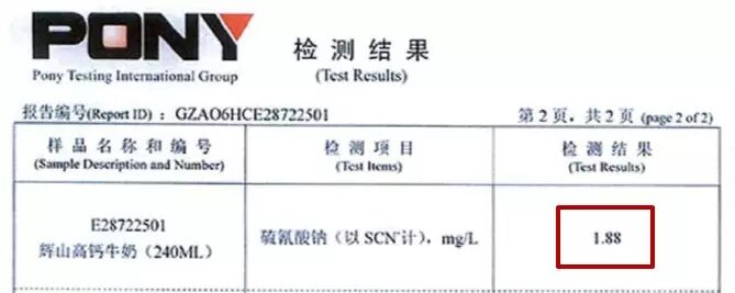 近期,河北省食品药品监督管理局刊登的一则《食品销售安全警示》称,近期,秦皇岛市食品和市场监督管理局对销售环节乳制品质量安全进行抽检,在辽宁辉山乳业集团生产的高钙牛奶中检出硫氰酸钠,数值达15.20mg/kg(最高限定值10.0mg/kg)。