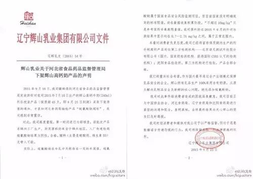 9月28日下午,辽宁辉山乳业集团有限公司(下称辉山乳业)在北京召开媒体沟通会,称对河北食药监管部门的检测结果“表示无法认可”,辉山乳业副总裁徐广义对河北食药局的执法和检测结果提出质疑,认为“河北食药局存在检测程序违规、检测结果不实、判断结论不当、信息发布违法四大问题”。