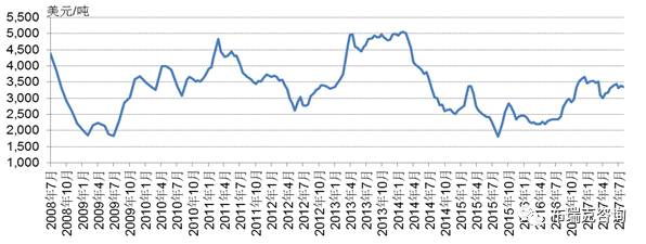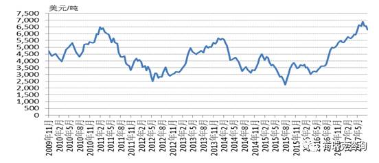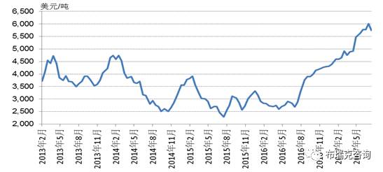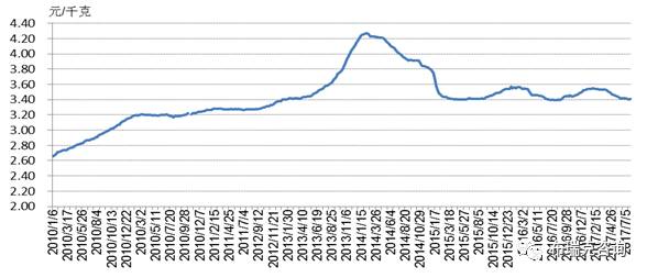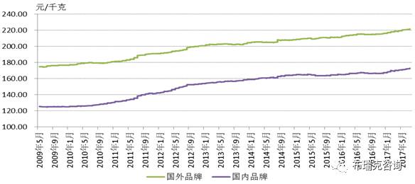 图5 中国市场婴幼儿奶粉零售价格走势周度,2009-2017