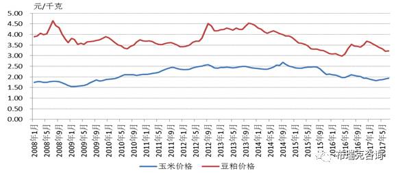 图4 中国玉米和豆粕现货市场价格走势,分月度,2008-2017