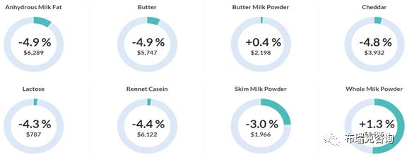其余产品:无水奶油下跌4.9%,平均价格为6289美元/吨,黄油下跌4.9%,平均价格5747美元/吨,奶酪比上次拍卖价格下跌4.8%至3932美元/吨,乳糖下跌4.3%,平均价格为787美元/吨,酪蛋白下跌4.4%,平均价格为6122美元/吨。