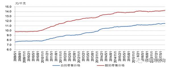 图6 中国市场液体乳零售价格走势周度,2009-2017