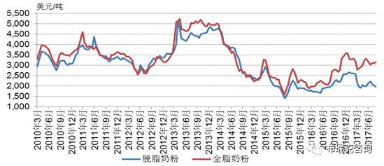 图8 GDT全脂奶粉和脱脂奶粉价格变化趋势,2008-2017