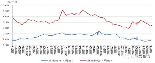 图3 中国玉米和豆粕现货市场价格走势,分周度,2010-2017