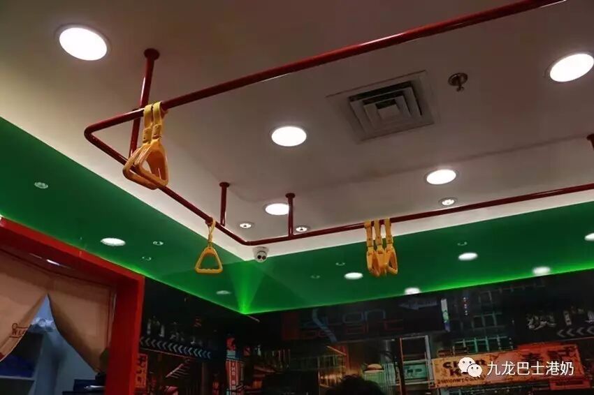 除了点单台的外观独特之外,吧台内的设计也是另人眼前一亮!香港街头夜市的墙纸,复古怀旧令人回忆不断!定眼一看,就可以看到这些垂在半空中手把,好像真的有坐在驶向香港的巴士车里一边享受豪华小食,一边欣赏沿途风景的感觉。
