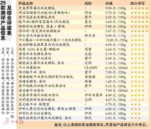 据了解,酸奶从工艺上分,有全脂和低脂的;从储藏方式上分,有冷藏、常温两种保存方式。检测的25款酸奶整体情况较优,全部酸奶样品均符合国家标准要求,全部合格。在食品添加剂的检测中,所有样品均在国家规定的安全值内,符合国家标准要求。未检出有添加三聚氰胺的情况;重金属、微生物指标、毒素类、营养指标检测结果均符合国家强制性标准要求。