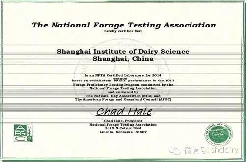 上海市奶牛研究所检测中心取得的美国NFTA认证证书