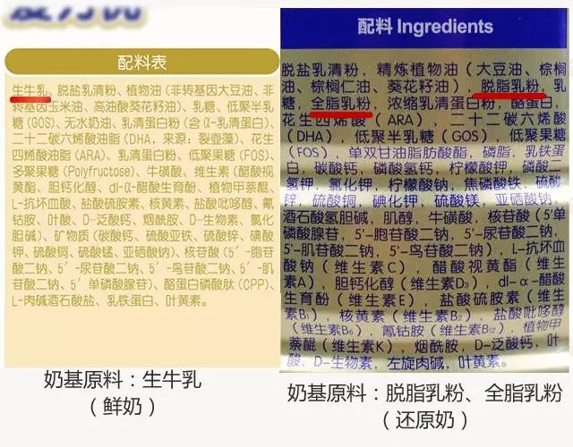 标有“牛奶”或者“生牛乳”这类液态原料的是鲜奶,写着“脱脂奶粉”这类固态原料的是还原奶。两者相比较,当然是鲜奶生产出的奶粉营养均衡,更新鲜、更营养、更安全。