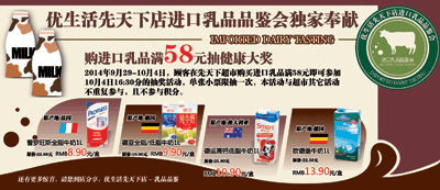 10月1-4日,顾客在先天下超市购买进口乳品满58元即可参加10月4日16:30分的抽奖活动,单张小票限抽一次。