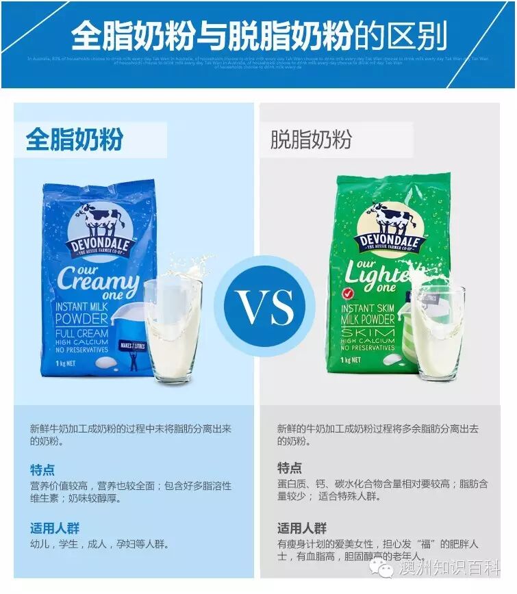 (1)制作:全脂奶粉是指新鲜牛乳在加工成奶粉的过程中,未将乳中的脂肪分离出去的产品。脱脂奶粉是指新鲜牛乳在加工成奶粉的过程中,将乳中的脂肪分离出去的产品。脱脂奶粉对于老年人,消化不良的婴儿,经及腹泻、胆囊疾患、高脂症、慢性胰腺炎等患者有一定益处。