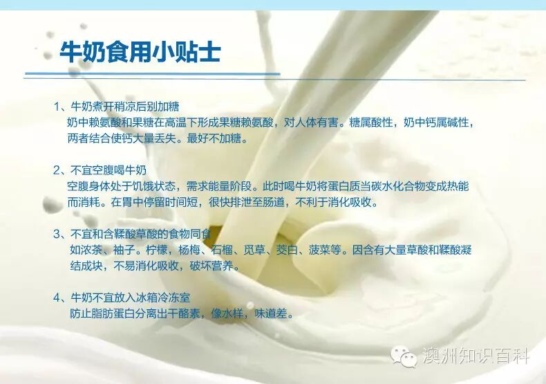 -不要空腹喝牛奶,同时还应吃些面包、糕点等,以延长牛奶在消化道中的停留时间,使其得到充分消化;