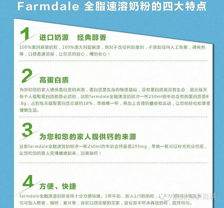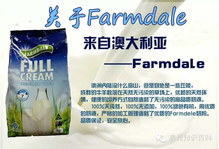 Farmdale全脂奶粉用纯乳生产的,基本保持了乳中的原有营养成分,蛋白质不低于24%,脂肪不低于26%,乳糖不低于37%。生产1 千克全脂奶粉约需8-9千克牛奶,食用时每份奶粉需8倍的温开水冲调。全脂的脂肪比低脂和脱脂高。全脂奶粉是由鲜牛奶消毒后经浓缩、喷雾、干燥而成的。鲜牛奶加工成奶粉后,水分由原来的88%降低到2%~5%(瓶装),蛋白质、无机盐、脂肪等营养素的含量浓缩了。