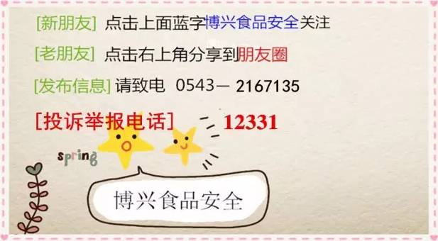 博兴食品安全--致力于发布博兴县内食品安全监管信息,介绍食品消费知识以及食品相关法律法规,推广县内各食品企业及产品。如果您想以后免费收到此类信息,第一时间了解博兴食品近况,欢迎关注“博兴食品安全”。