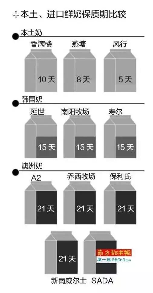 目前,韩国进口的鲜奶,主要有延世、南阳牧场和寿尔牌,保质期均为15天;澳洲奶主要有A2、乔西牧场、保利氏、新南威尔士、SADA等,保质期21天左右。
