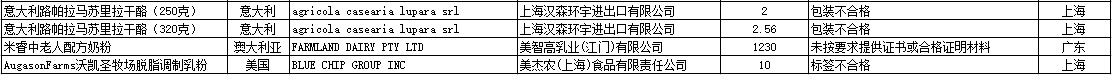 此外,还有20批次来自澳大利亚、比利时、法国、美国、白俄罗斯、德国和意大利的脱脂牛奶、纯牛奶、调制乳粉、风味发酵乳、水牛奶酪和马苏里拉干酪共计10.49吨的乳制品也被检出不合格,不合格原因有超过保质期、亚硝酸盐超标、标签不合格、蛋白质含量不符合食品安全国家标准要求、净含量误差超出允许范围等,这些产品均被作退货或销毁处理。