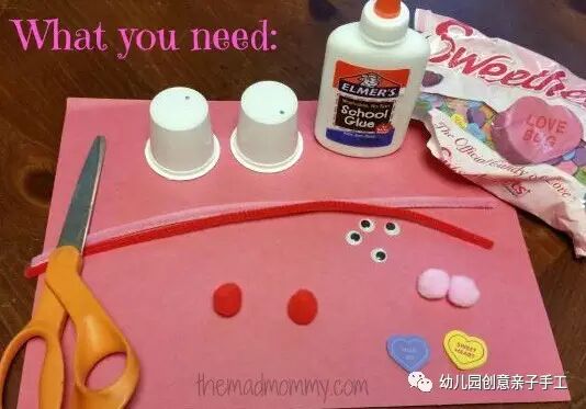 酸奶瓶、扭扭棒、毛球、手工眼镜、多个心形卡片、白乳胶、剪刀