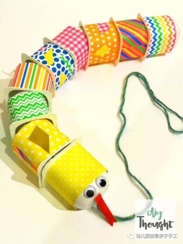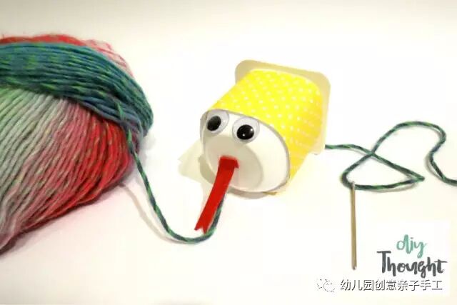 2.取一个贴好纸片的酸奶瓶,完成眼睛与舌头部位的粘贴后,在瓶子中部穿过一条毛线。小蛇的头部就基本完成了。