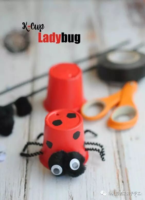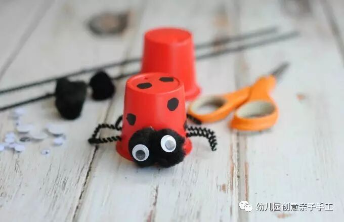 将酸奶杯染成红色,粘上剪好的黑胶胶带做斑点、与扭扭棒的手脚,最后,贴上手工眼睛即可。