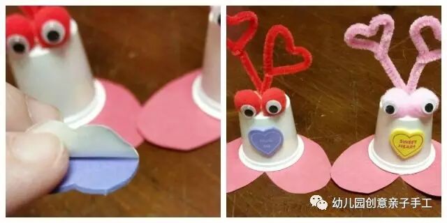1.先在酸奶瓶中放入糖果片,盖上心形卡片(大小以酸奶瓶为准),用白乳胶粘合。