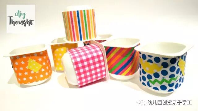 1.七八个酸奶瓶,将它们洗净晾干,贴上彩色纸片。